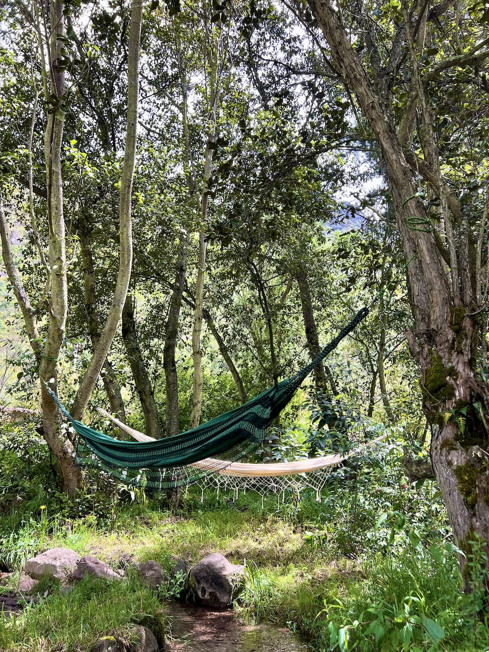 Each part of the sanctuary has been tended with care to support presence. Gentle trails follow the river and wind through groves of native trees, flowering gardens, and fruiting orchards, while hammocks and resting spaces invite you to pause and breathe. Cozy cabins and intimate gathering areas are thoughtfully integrated into the landscape, allowing nature to hold and nourish you throughout your stay.